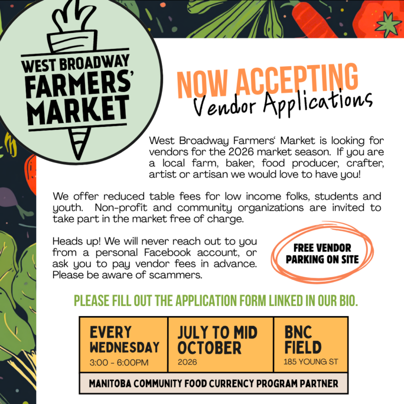 2026 UPDATE: West Broadway Farmers' Market is back for the 2026 season! We are currently seeking market vendors! If you are interested in becoming a vendor at West Broadway Farmers' Market please read through the IMPORTANT VENDOR INFORMATION handout, and fill out the VENDOR APPLICATION FORM below: